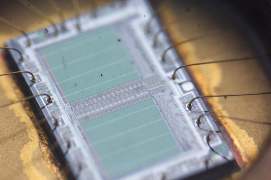 レンズには装着する向きがありますが、それを真逆に装着するためのアダプタです。実はこれも接写を可能にするテクニックです。 レンズが広角であればあるほど良いらしく、低倍率の顕微鏡のような世界を垣間見ることができます。 2枚目はリバースリングを用いてレンズを装着したところ、3枚目はこの状態でレンゲソウを接写したもの、5枚目はICチップを接写してワイヤーボンディングが見えている状態です。 5枚めのICチップは4枚目の白い部品の中央部に見えている部分です。指と比べると、その小ささをおわかりいただけるかと思います。